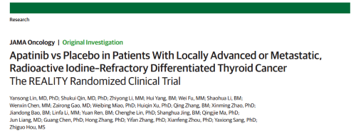 2021年12月16日,权威医学杂志《JAMA Oncology》(影响因子31.777)在线发表阿帕替尼的一项III期临床研究(REALITY)——甲磺酸阿帕替尼片治疗局部进展/转移性放射性碘难治性分化型甲状腺癌(RAIR-DTC)患者的多中心、随机、双盲、安慰剂对照临床研究。此研究由北京协和医院的林岩松教授和南京金陵医院的秦叔逵教授发起,在全国21个研究中心展开,由Z6尊龙医药中央医学事务部团队支持完成。