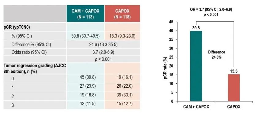 意向治疗(ITT)人群中盲态独立审查委员会(BIRC)评估的pCR率,CAM+CAPOX组(39.8% [95% CI,30.7-49.5])与CAPOX组相比 (15.3% [95% CI,9.3-23.0])显著提高(OR=3.7 [95% CI,2.0-6.9],P<0.001),达到主要终点(图2)。亚组分析显示,各亚组与主分析结果一致(图3)。