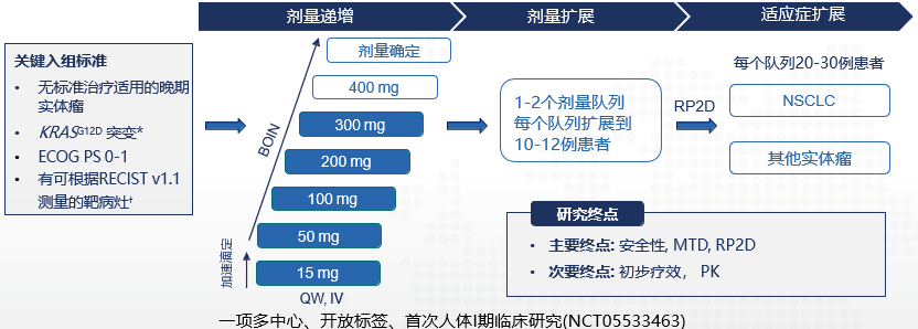 既往标准治疗失败且组织学证实的晚期KRASG12D突变实体瘤患者接受HRS-4642静脉注射,剂量分别为15、50、100、200和300 mg QW,21天为1周期。剂量递增部分允许KRAS突变患者。采用贝叶斯最优区间设计的加速滴定法指导剂量递增并确定最大耐受剂量(MTD)。主要终点是安全性、MTD和推荐的2期剂量(RP2D)。